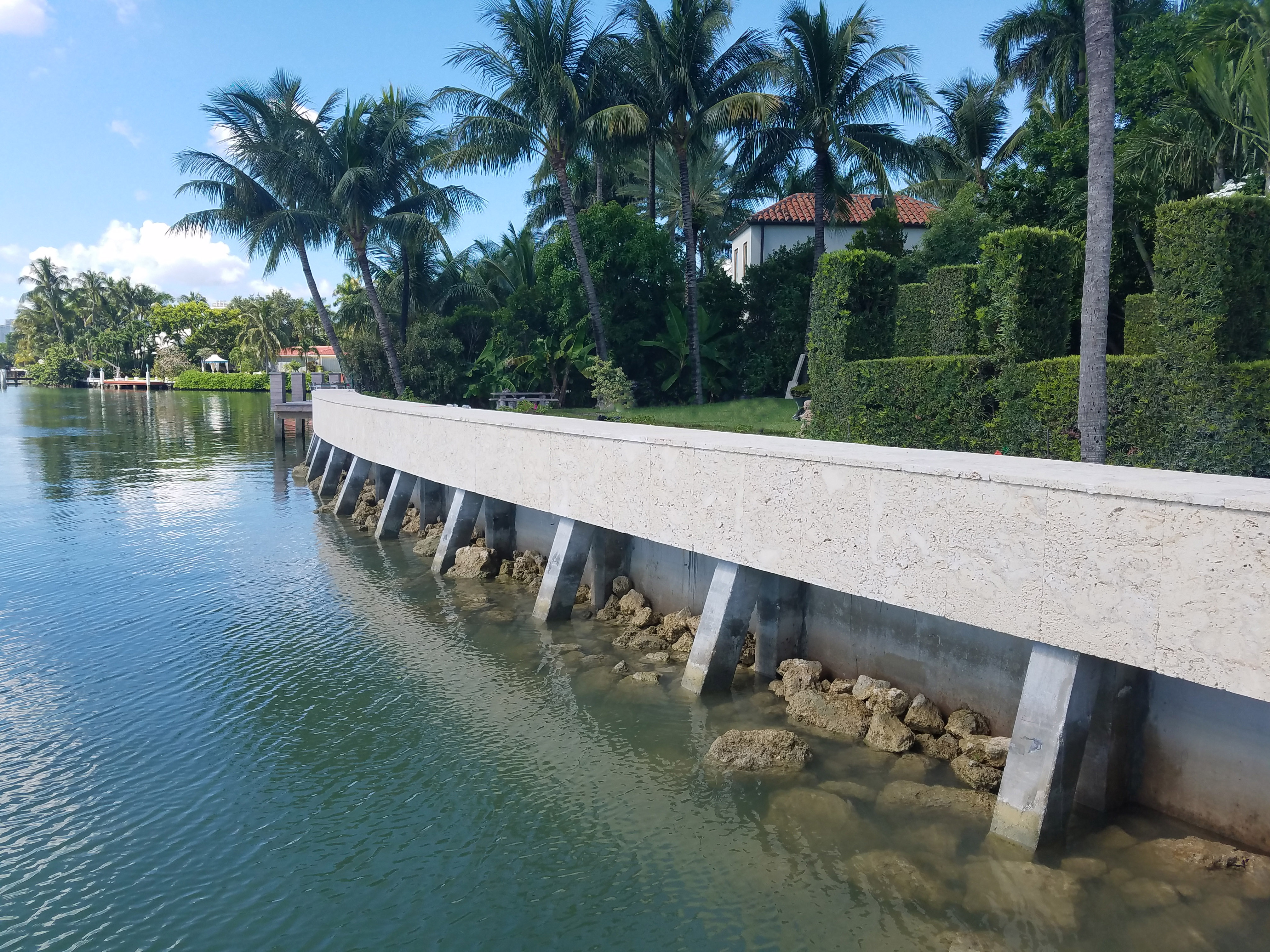 Magnificent Spanish villa on the Beach was in the middle of an ill-advised batter & cap repair to their old original seawall (from another contractor) when a large portion of the seawall collapsed into the water, along with an equally large amount of the homeowner’s yard. Dock & Marine came, installed emergency shoreline stabilization measures, and proceeded to build one of the finest looking seawalls in Dade county. The entire cap is enclosed with custom fitted keystone panels, and a large french drain system in the backyard alleviates an pressure on the seawall.